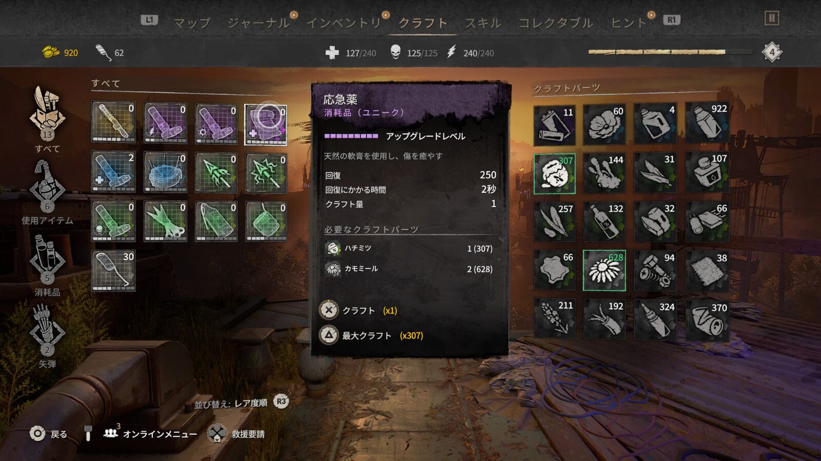 自分応急薬を真っ先に最大までアップグレードしたからここでボロクソ言われていてえってなりました。あとアップグレードって「レア」のトロフィーが不足がちになるんですが自分だけですかね。